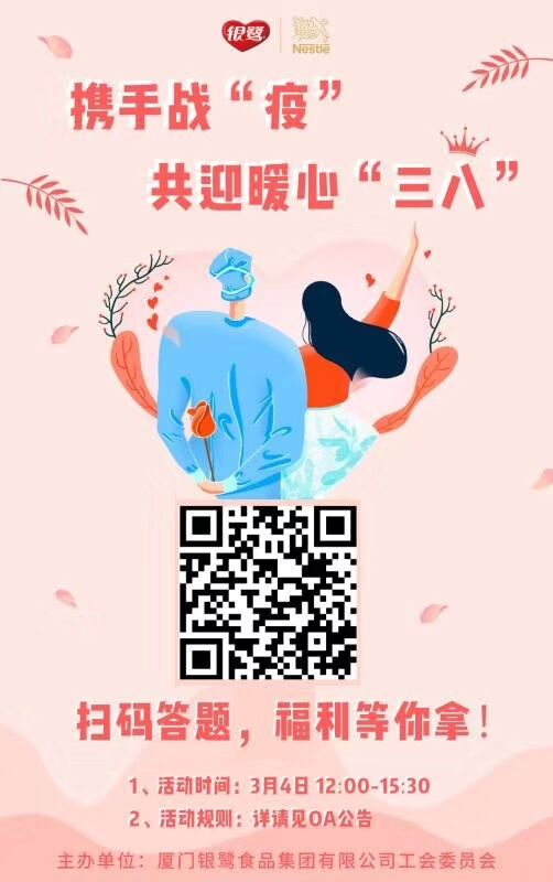 為慶祝節(jié)日的到來,銀鷺食品集團工會委員會,人力資源中心圍繞“攜手戰(zhàn)“疫” 共迎暖心三八“這一主題,開展系列活動,活動由廈門銀鷺與雀巢大中華區(qū)活動有機結合,為女性員工們送上特別的祝福與問候。