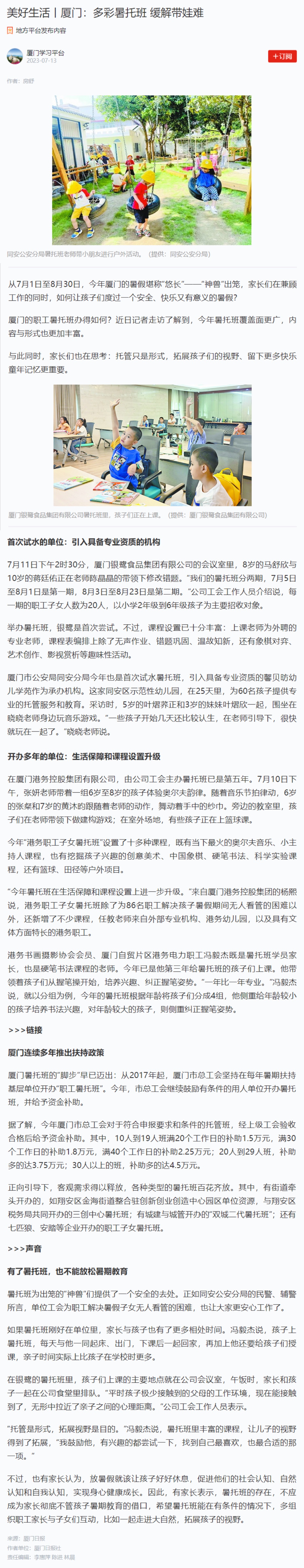 多彩暑托班,緩解帶娃難——記銀鷺食品集團首次舉辦暑托班(來源:廈門日報)發布日期:2023-07-20
